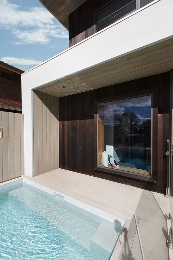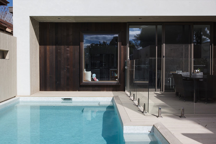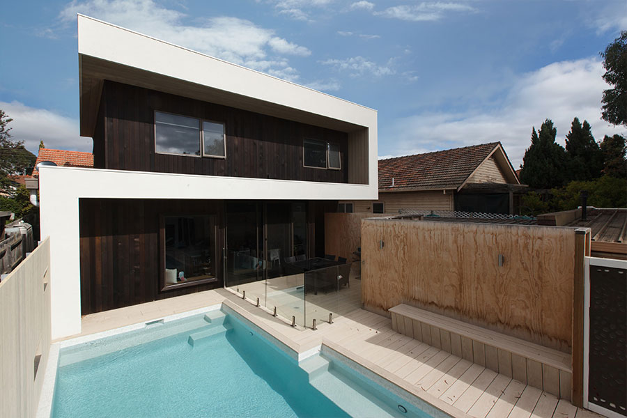 Rear 2-storey addition to a modest home in Kew. This project was about family lifestyle, large open kitchen, dining, living area to entertain with direct access to deck area with BBQ area and built in pool. External timber cladding, double glazed windows, composite decking around the pool to remove ongoing maintenance.